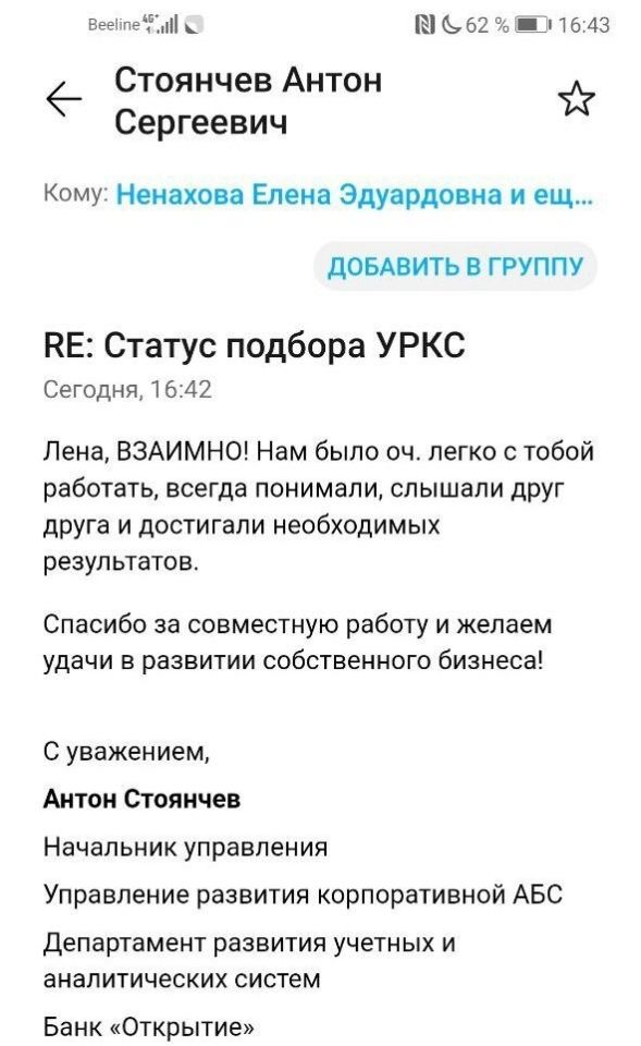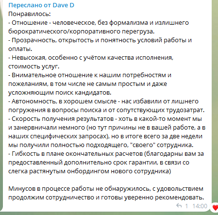 - Ведение кандидата после выхода на работу к Заказчику: контрольные звонки, посредничество, помощь в адаптации;